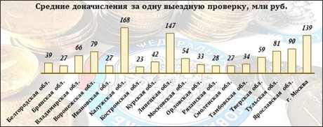 Средняя сумма доначислений в результате одной выездной проверки равняется 110 млн руб. Год назад визит налоговых инспекторов обходился в 89 млн руб. Таким образом, за год величина доначислений по завершении одной выездной проверки выросла на четверть или 21 млн руб.