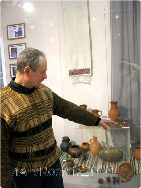 Познакомились мы и с Задонскими мастерами – Владимиром Ряжским и Надеждой Чурсиной. Надежда занимается романовской игрушкой-свистулькой уже более 10 лет. А в общей сложности ее стаж в этом искусстве составляет все 15. Владимир Михайлович – гончар. Занимается он этим промыслом еще с 90-х годов. Это было не только его увлечение, но и способ зарабатывания денег. Начинали они вместе. Сами изобрели круг, сами искали глину, искали старых мастеров и перенимали у них опыт.