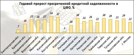 За этот же год просроченная задолженность жителей ЦФО подскочила на четверть – с 371 до 463 млрд руб. Сумма непогашенных вовремя займов менее чем на 10% выросла лишь в Курской и Белгородской областях. В других регионах темпы увеличения просроченной задолженности легко справились с обозначенным рубежом.