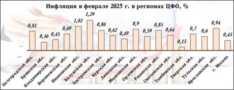 В двух регионах общий инфляционный показатель перешагнул за 1%. Больше всего в феврале услуги, продовольственные и непродовольственные товары прибавили в стоимости в Ивановской и Калужской областях. Минимальные значения инфляции зафиксированы в Тамбовской и Брянской областях, а также в столице. В этих регионах в заключительный месяц зимы цены выросли менее чем на 0,5%.
