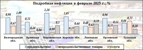 В регионах присутствия ИА vRossii.ru продукты в феврале больше всего подорожале в Воронежской области (+1,26%), непродовольственные товары – в Тульской области (+0,77%), а услуги – в Белгородской области (+1,09%).