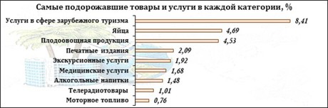 В целом по Центральному округу в категории "Продовольствие" максимальный рост цен наблюдался на алкогольные напитки (+1,5%), плодоовощную продукцию (+4,5%) и куриные яйца (+4,7%). В отделе непродовольственных товаров сильнее всего подорожали печатные издания (+2%), телерадиотовары (+1%) и моторное топливо (+0,8%). В категории "Услуги" наибольшее повышение стоимости отмечается на медицинские услуги (+1,7%), экскурсионные услуги (+1,9%) и услуги в сфере зарубежного туризма (+8,4%).