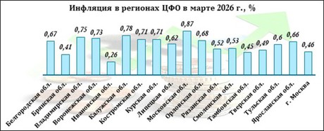 В конце первого квартала 2026 года товары и услуги больше всего подорожали в Московской области (0,87%). Это единственный регион, в котором инфляция максимально плотно приблизилась к 1% В остальных субъектах рост цен был чуть умереннее. Например, в Калужской области инфляция составила 0,78%, во Владимирской области – 0,75%. Менее чем на полпроцента цены увеличились в пяти регионах округа – Ивановской, Брянской, Тамбовской и Тверской областях, а также в столице.
