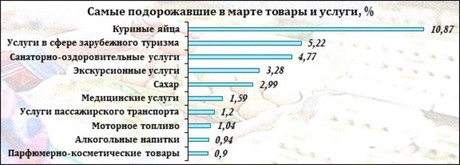 В марте больше всего увеличилась стоимость куриных яиц. На фоне ажиотажного пасхального спроса этот продукт в среднем по Центральному округу подорожал на 11%. Кроме этого, на 5% подорожали услуги в сфере зарубежного туризма и санаторно-оздоровительные услуги.