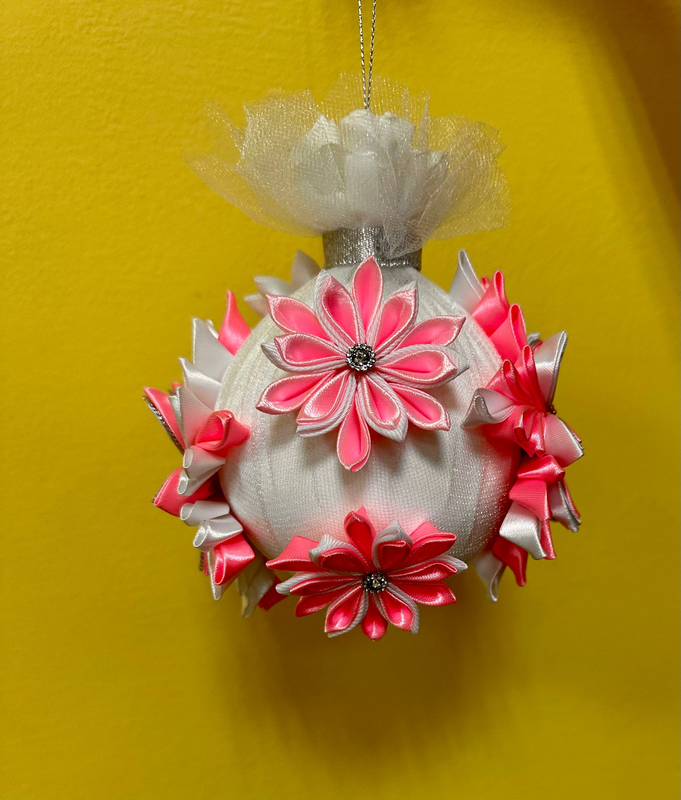 Описание: Шар из пенопласта, обклеен белой тканью и блестящим фатином.Украшения - снежинки выполнены из атласной ленты в технике Канзаши и украшены кабошонами.