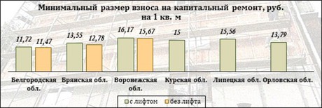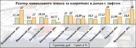 По сравнению с цифрами годичной давности тариф увеличился во всех рассматриваемых нами регионах. Причем рост одинаков для взносов и в домах с лифтами, и без них. Лишь в Воронежской области имеется небольшая разница. Минимальный размер взноса для жителей многоэтажек с лифтами повысился на 17,3%, в домах без них - на 13,6%. Разница объясняется тем, что тариф по такому принципу в столице Черноземья дифференцирован впервые.