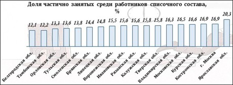 Доля частично занятых в общем количестве работающих в зависимости от региона варьируется от 12 до 20%. Наихудший показатель в Ярославской области. В этом регионе каждый пятый сотрудник "недорабатывает" до трудовой нормы. Лучше ситуация с занятостью персонала в Белгородской и Тамбовской областях. В этих субъектах только каждый десятый трудится меньше восьми часов в день.