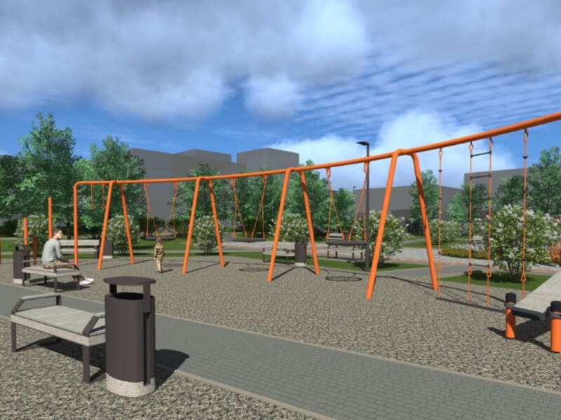 В зоне «ожидания» появятся: информационное табло с расписанием поездов, парковые скамейки, парклеты, оборудованные места для чемоданов, качели с навесами.